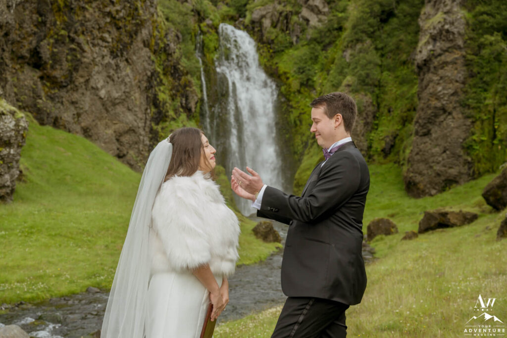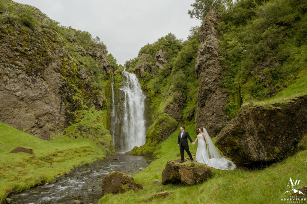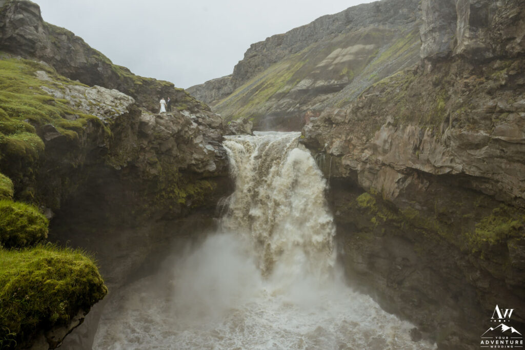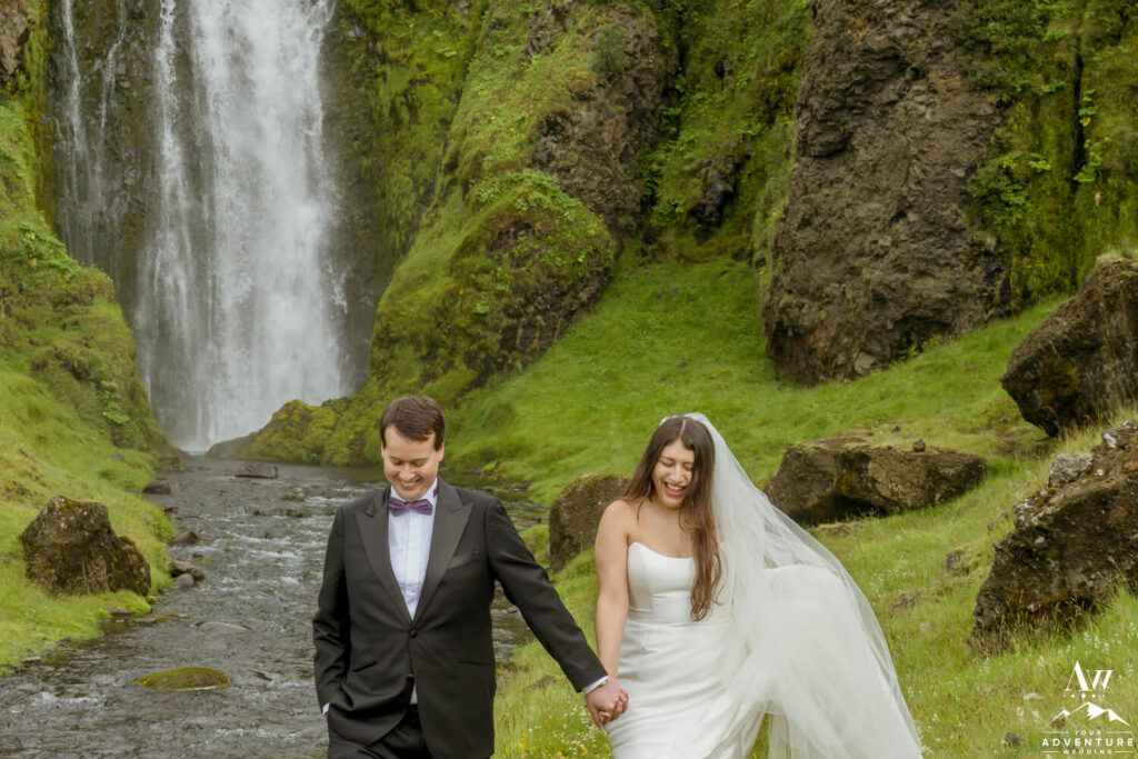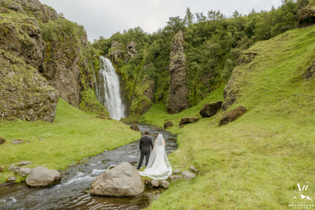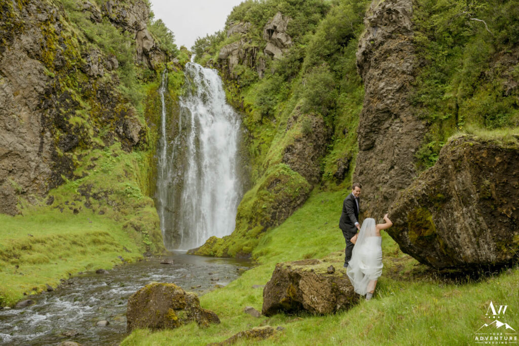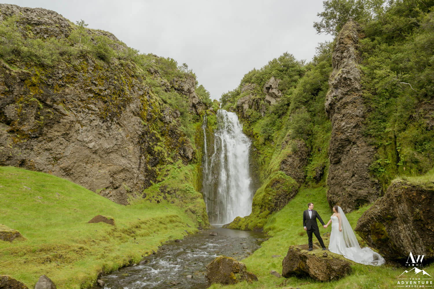 Meanwhile, did you know that there are several places in Iceland that give off Hawaii or Kauai vibes? To illustrate, the next location on their Iceland wedding itinerary is definitely classified as one of them! Here Daphne and Ben explored a picturesque canyon often compared to something out of Hawaii. Why you might wonder? Well! Lush green meets steep cliffs, and a stunning river flowing through lava rock!