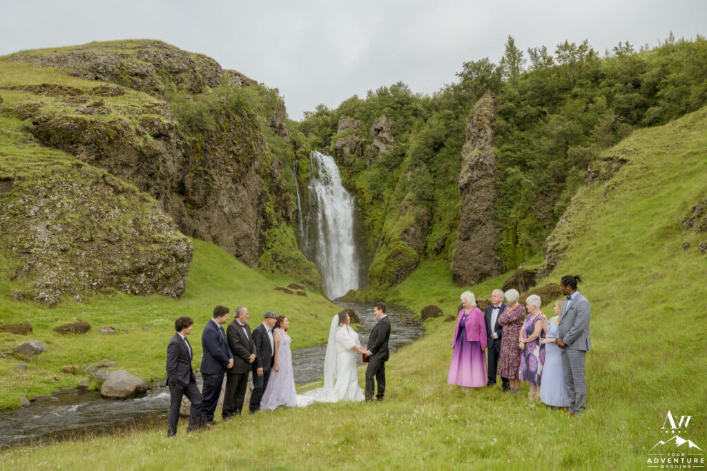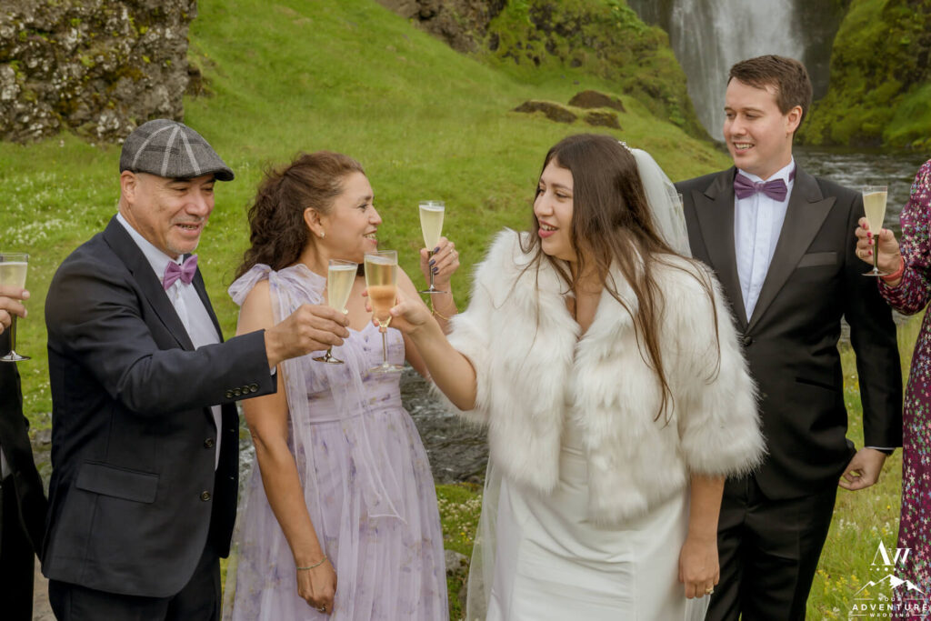How exciting the couple gifted their loved ones with a thrilling journey into the interior of Iceland! Since the couple had previously had marriage paperwork completed, they chose to hold a symbolic wedding ceremony in Iceland. At this secluded waterfall deep in the highlands, the pair thoughtfully said their personal vows to each other. Fair to say the sound of cascading water created an inspiring soundtrack to their highland waterfall wedding. Truly, no need for a traditional altar here as Iceland’s wilderness provided a setting more breathtaking than any venue could offer! Next, following the ceremony the group toasted with bubbles to the newlyweds new chapter!