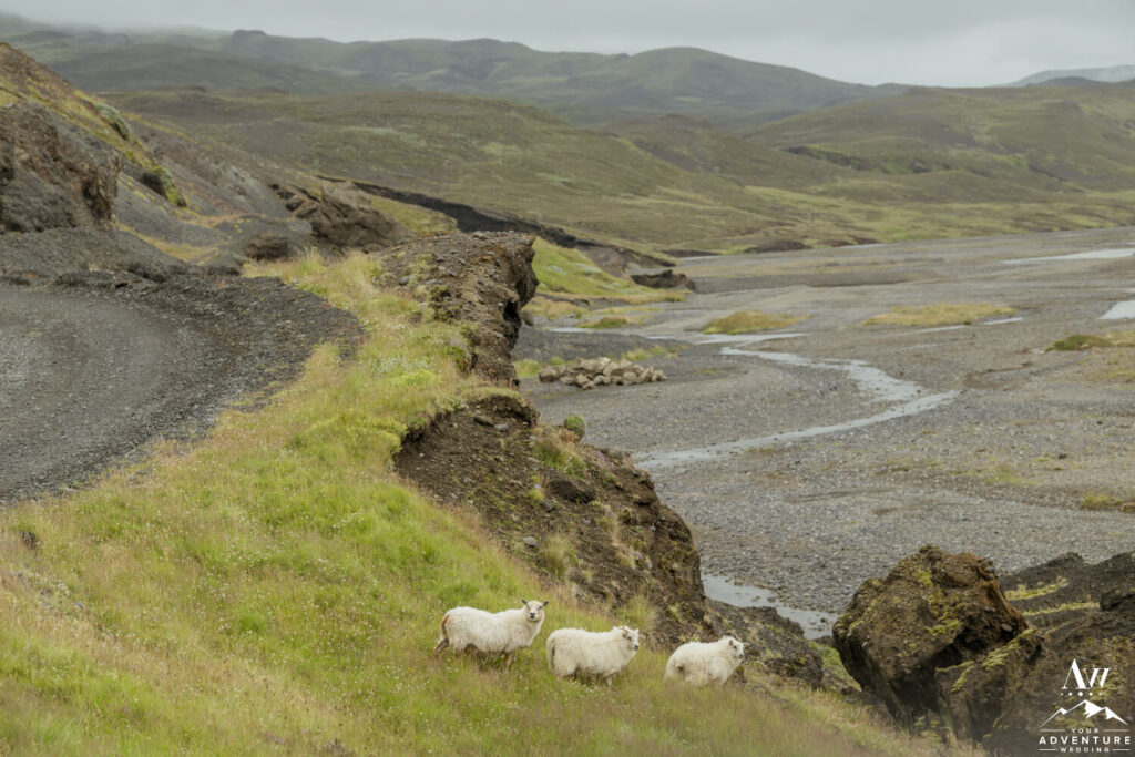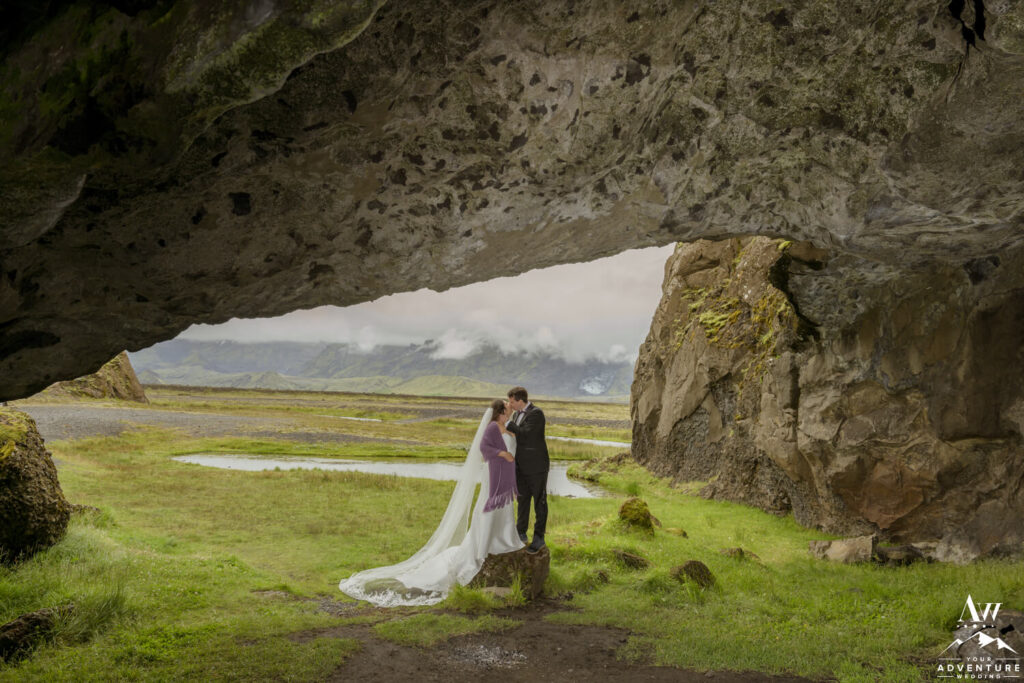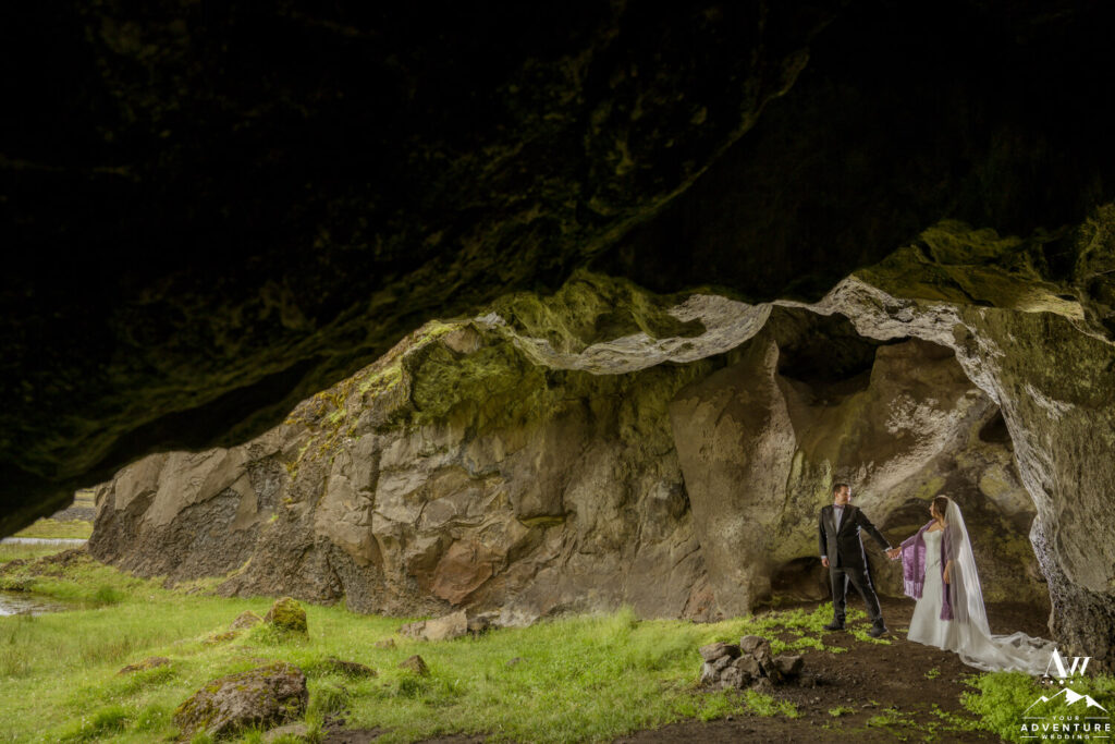 Next on their highland waterfall wedding schedule, our team planned a lunch at a natural cave. Packed lunches fit the schedule best alongside some Icelandic coffee, hot chocolate, and donuts. Additionally, the group took time to discover the geological rich area! The group left in two different super jeeps as the guests returned to the hotel while the couple continued on for more highland adventures… Perfect balance!