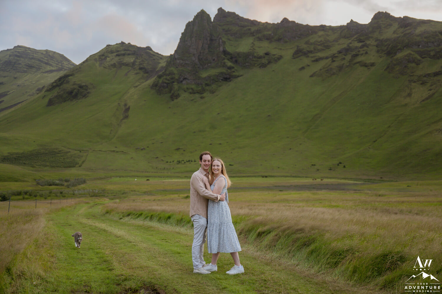 Ryan and Helen were on an epic Iceland self drive journey and new Vik was a iconic looking town full of charm. So why not find the local Iceland wedding photographer who lives in Vik to make their wish happen?! Heck yes! After all, Vik is a waypoint for the South and way to picturesque to pass up! First, the session begins with a short hike to the top of the hill that overlooks the town. Second, that very early morning start provided us with the dreamiest light! Third, we even were photobombed by our neighbors super sweet kitty making it even more fun! To illustrate, can you spot the kitty?