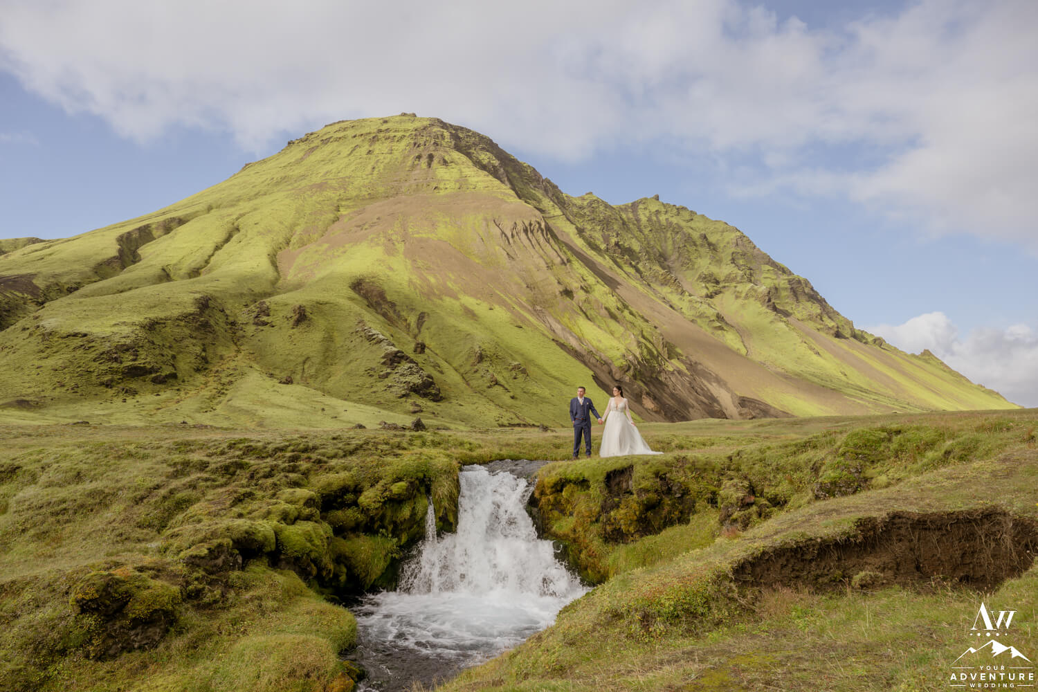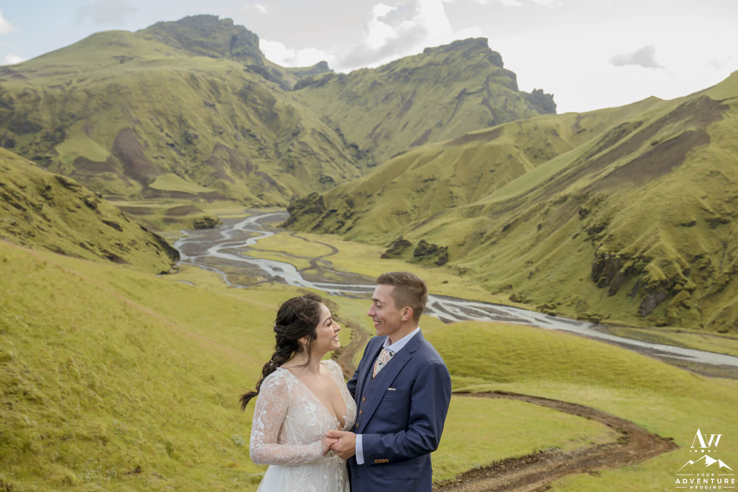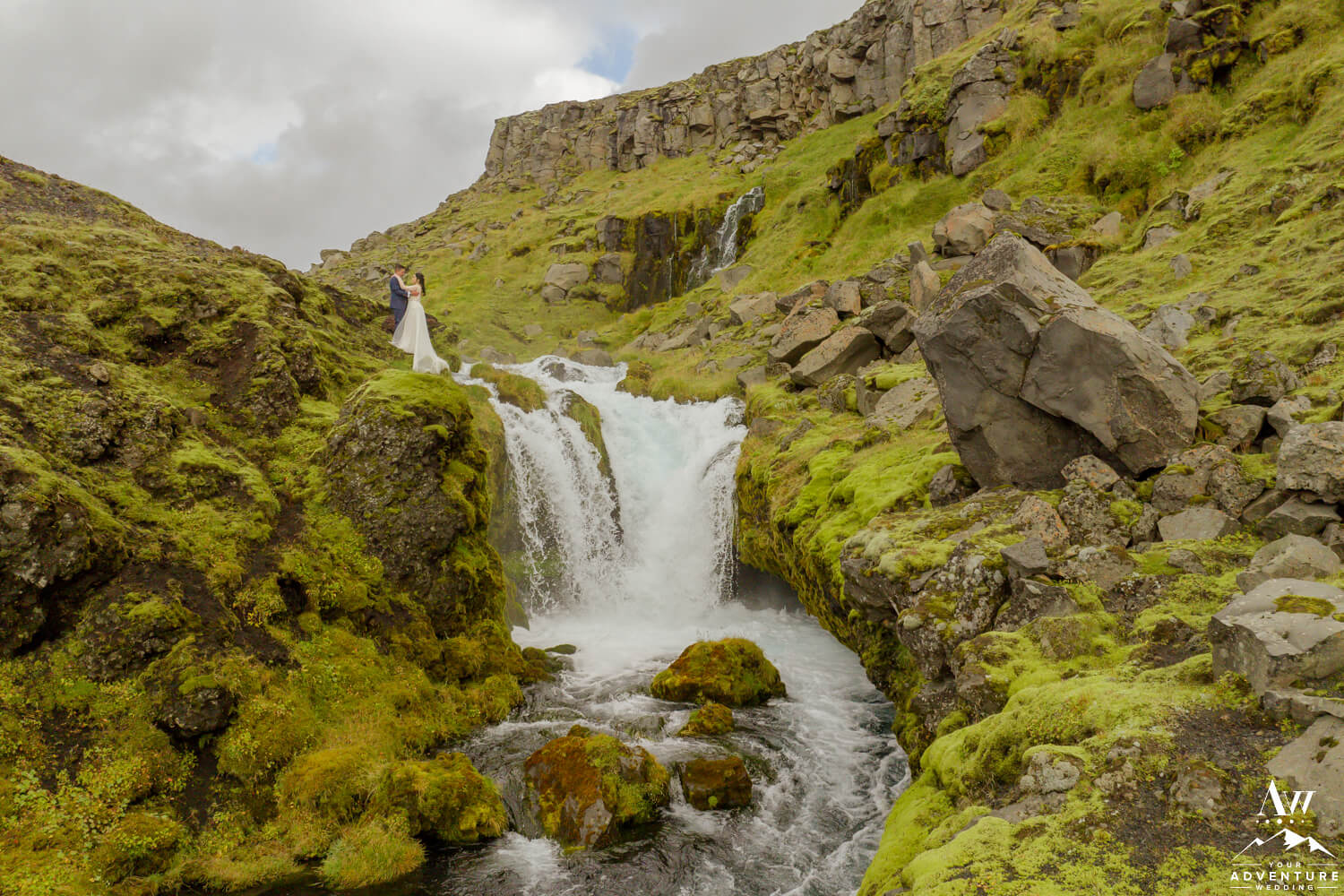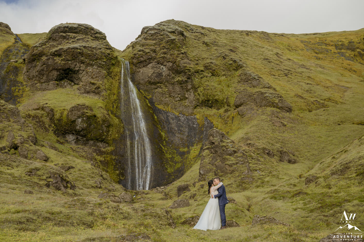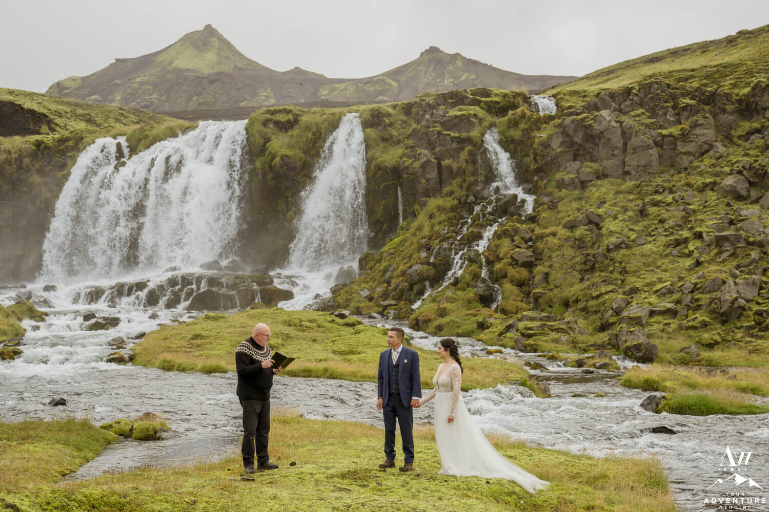 Next, the soon to be newlyweds chose to head into the Icelandic Highlands for a thrilling ride. After, they exchanged vows in a quiet spot in front of a stunning mountain waterfall. For instance, no arch, no chairs, no sound system. Just the presence of our Pastor and words they wrote for each other in personal vows. They laughed, smiled, and embraced. Meanwhile, the moment felt real and unfiltered, which fit their Iceland September Elopement perfectly!