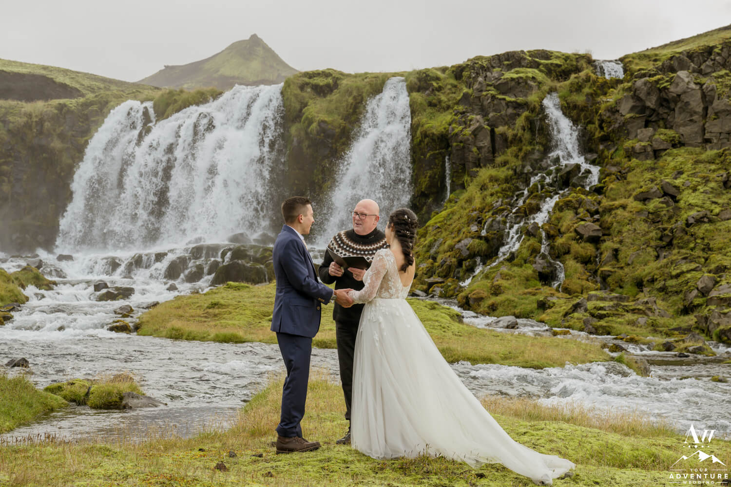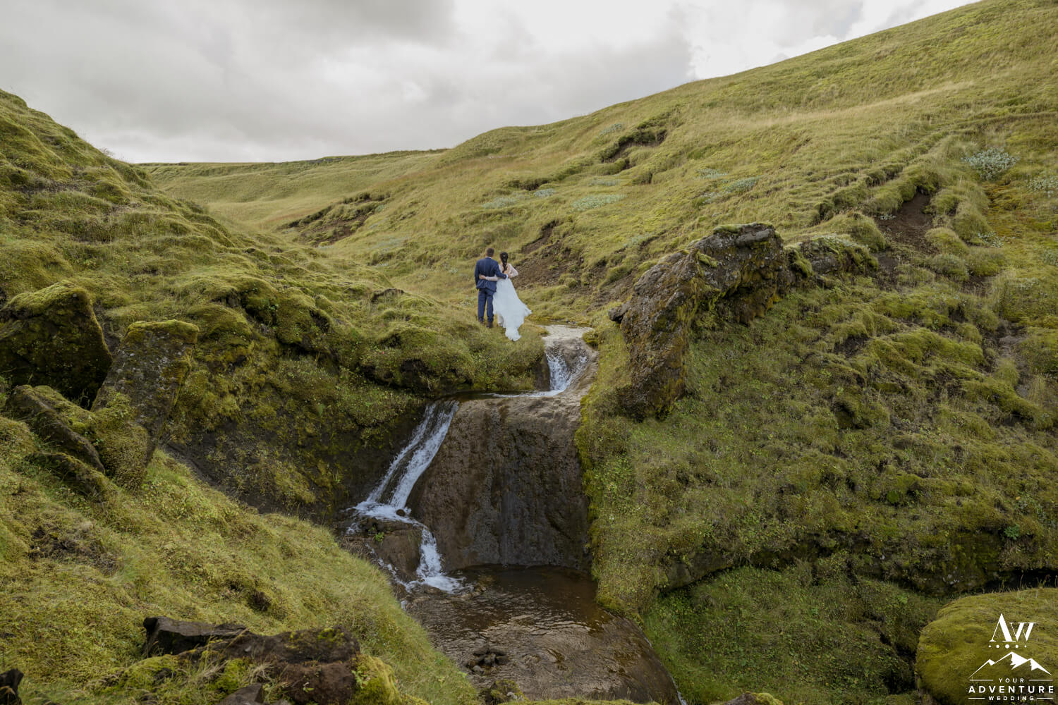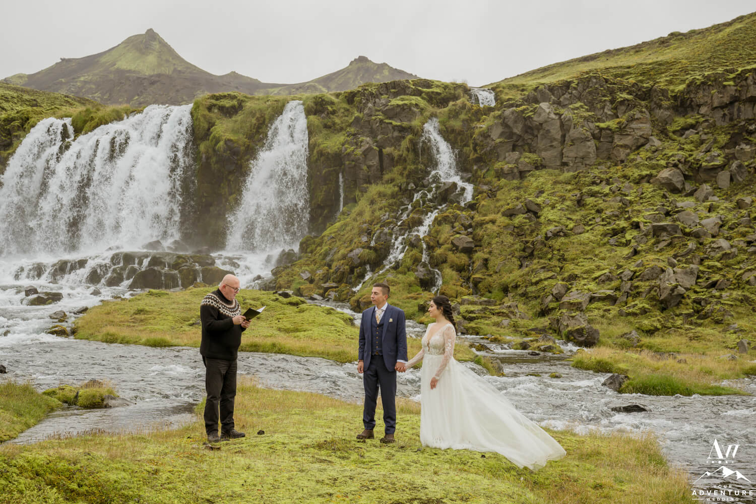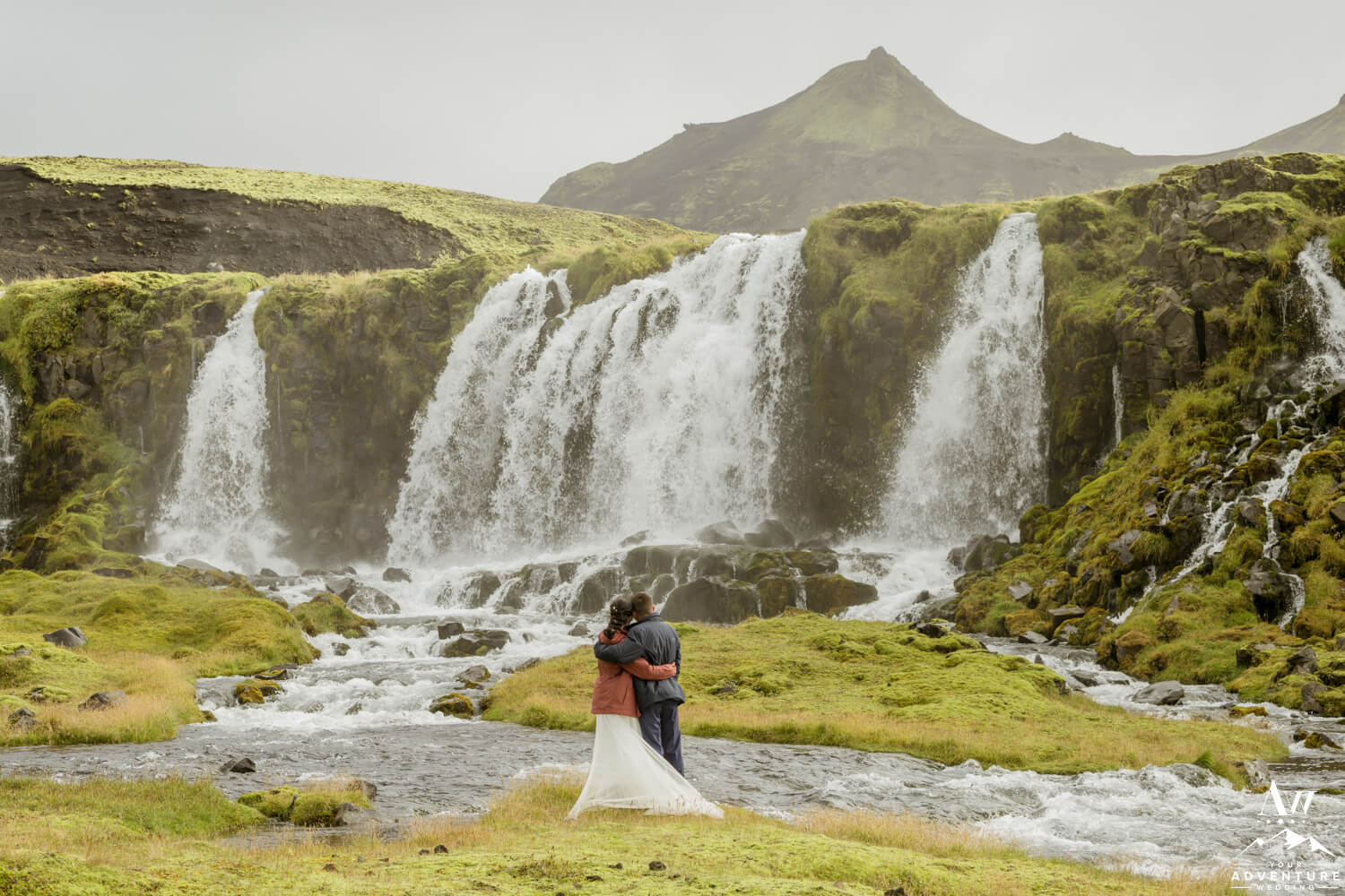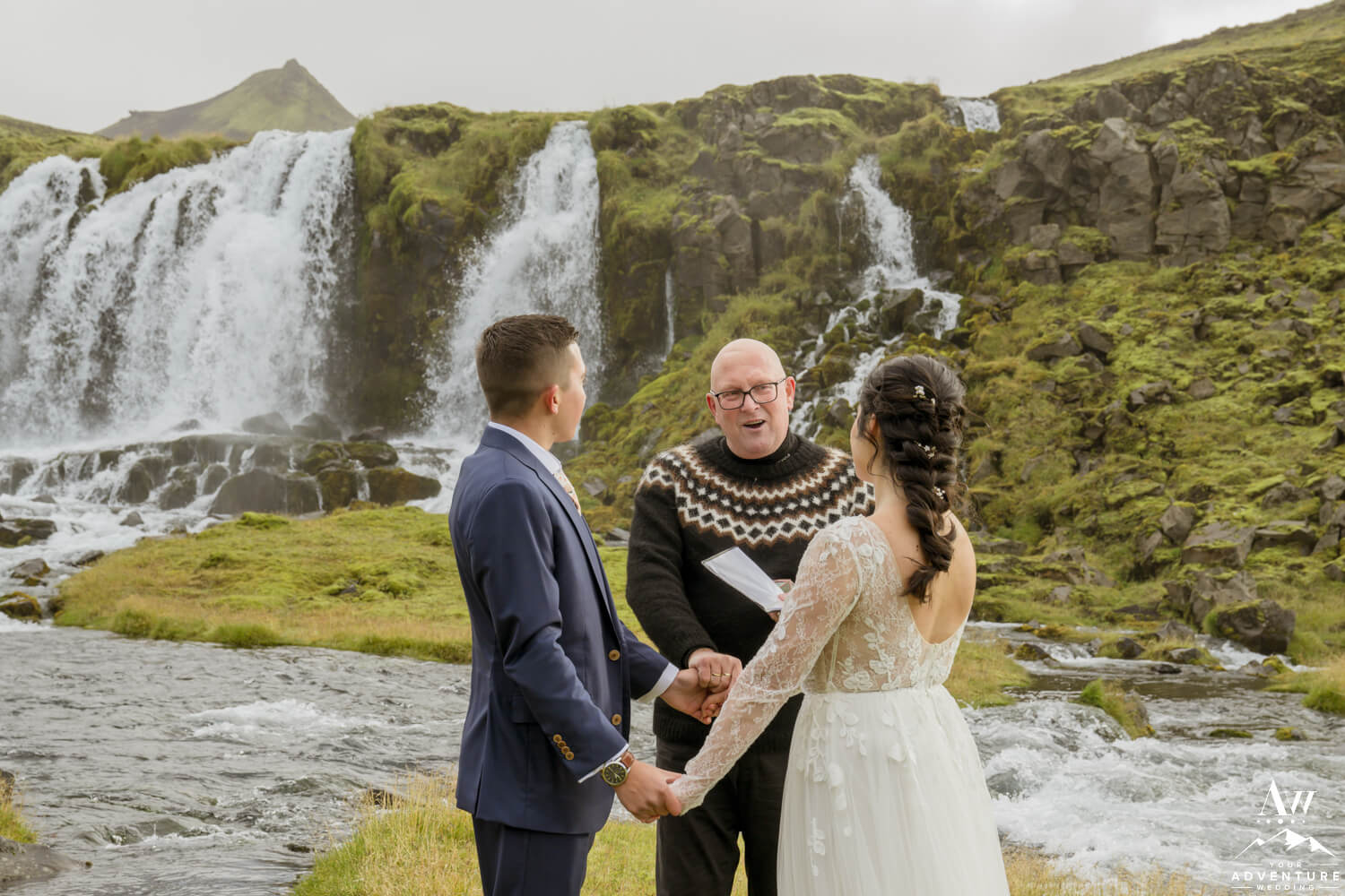 Next, the soon to be newlyweds chose to head into the Icelandic Highlands for a thrilling ride. After, they exchanged vows in a quiet spot in front of a stunning mountain waterfall. For instance, no arch, no chairs, no sound system. Just the presence of our Pastor and words they wrote for each other in personal vows. They laughed, smiled, and embraced. Meanwhile, the moment felt real and unfiltered, which fit their Iceland September Elopement perfectly!