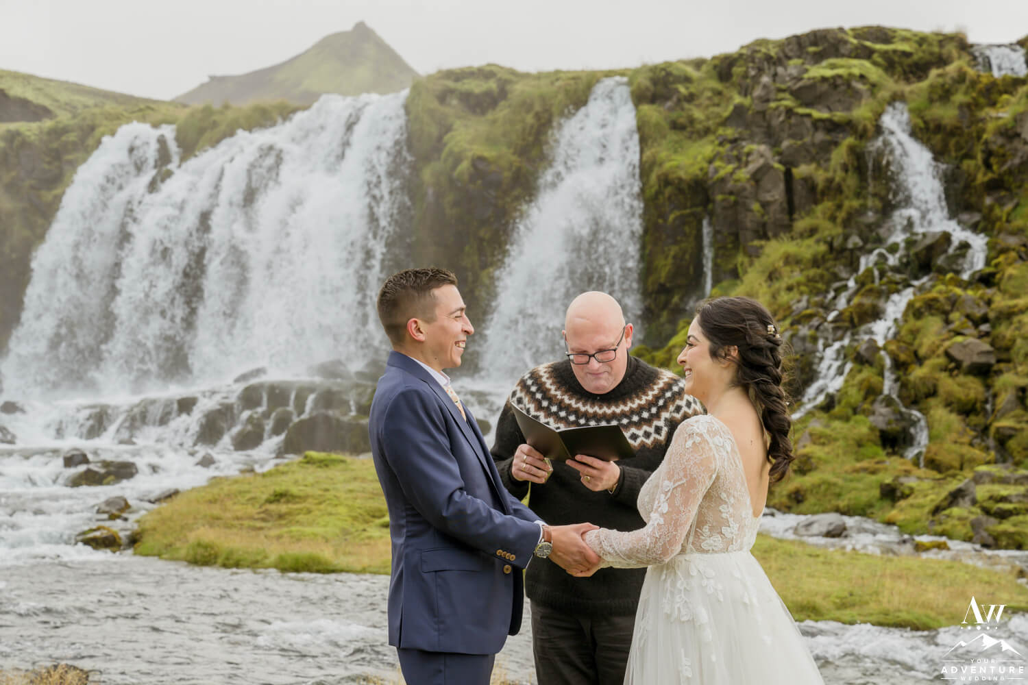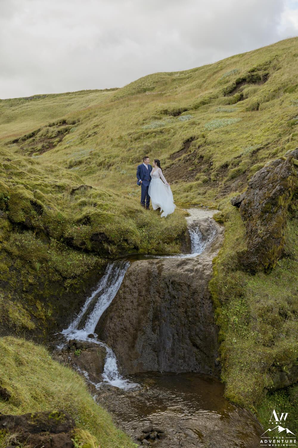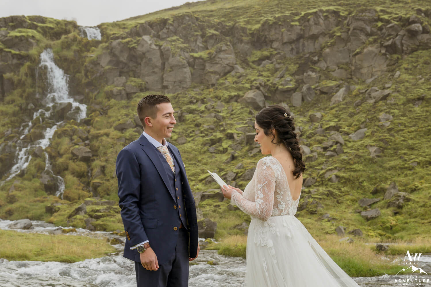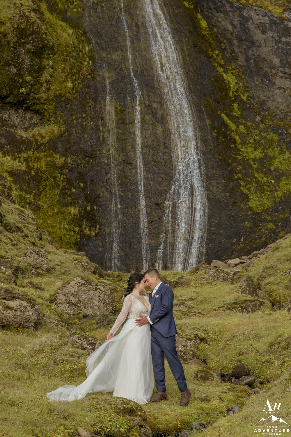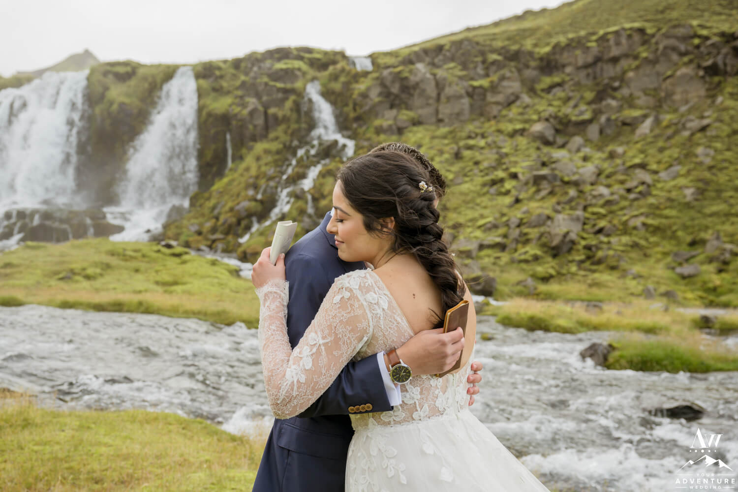 Next, the soon to be newlyweds chose to head into the Icelandic Highlands for a thrilling ride. After, they exchanged vows in a quiet spot in front of a stunning mountain waterfall. For instance, no arch, no chairs, no sound system. Just the presence of our Pastor and words they wrote for each other in personal vows. They laughed, smiled, and embraced. Meanwhile, the moment felt real and unfiltered, which fit their Iceland September Elopement perfectly!