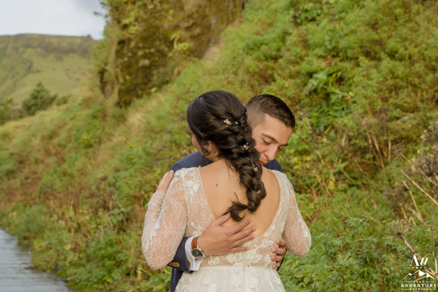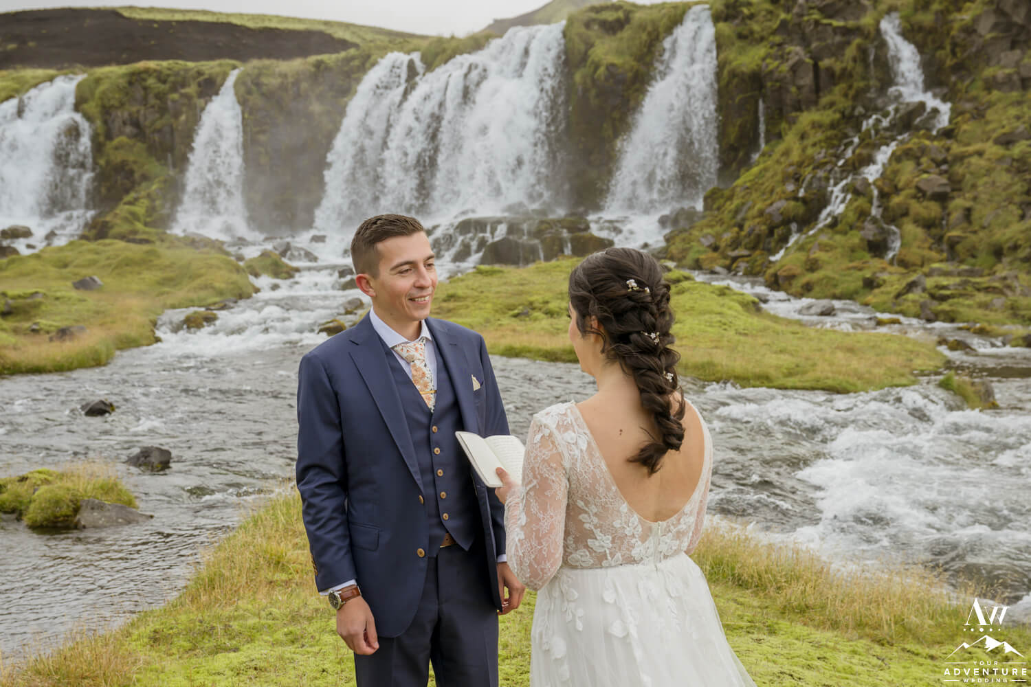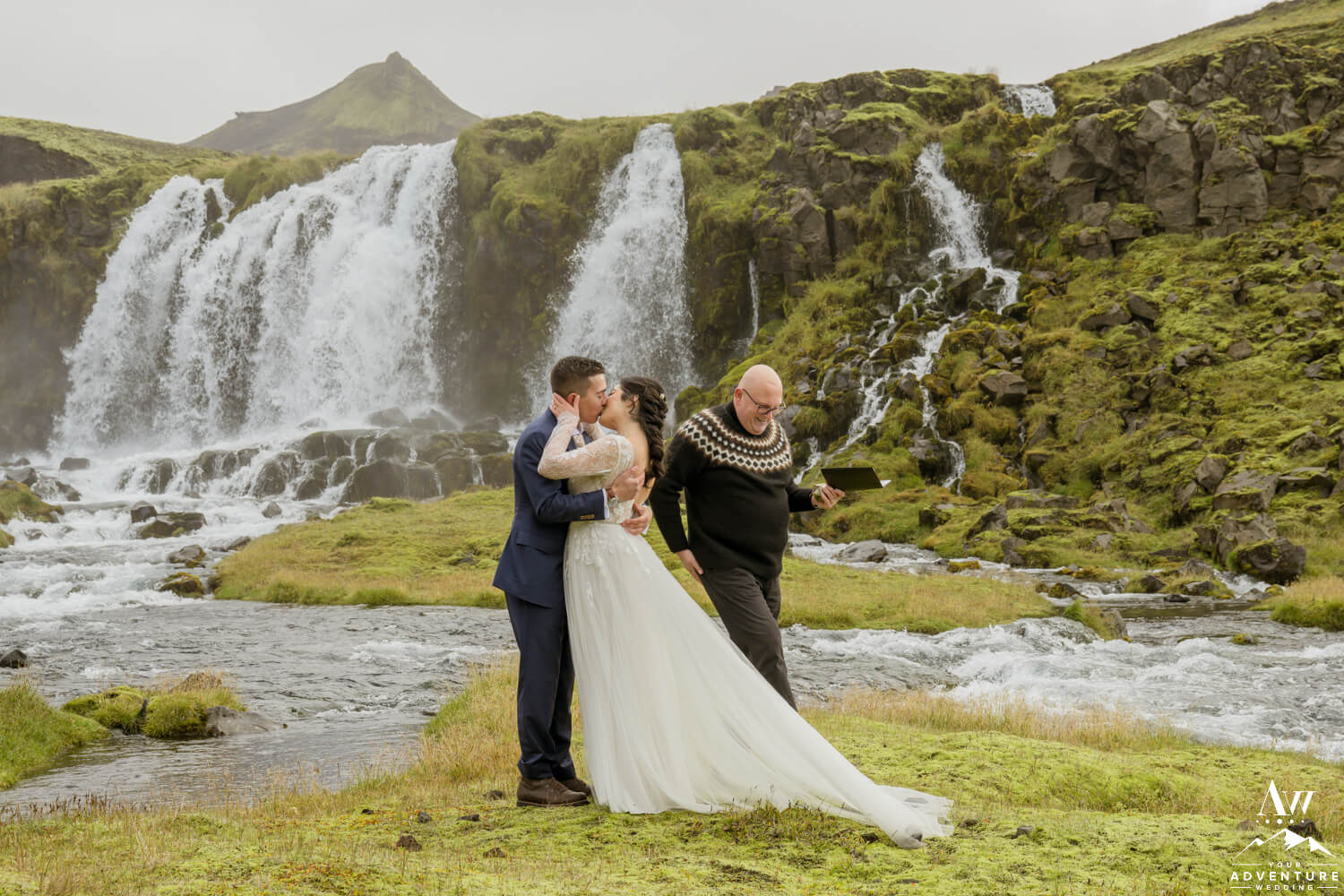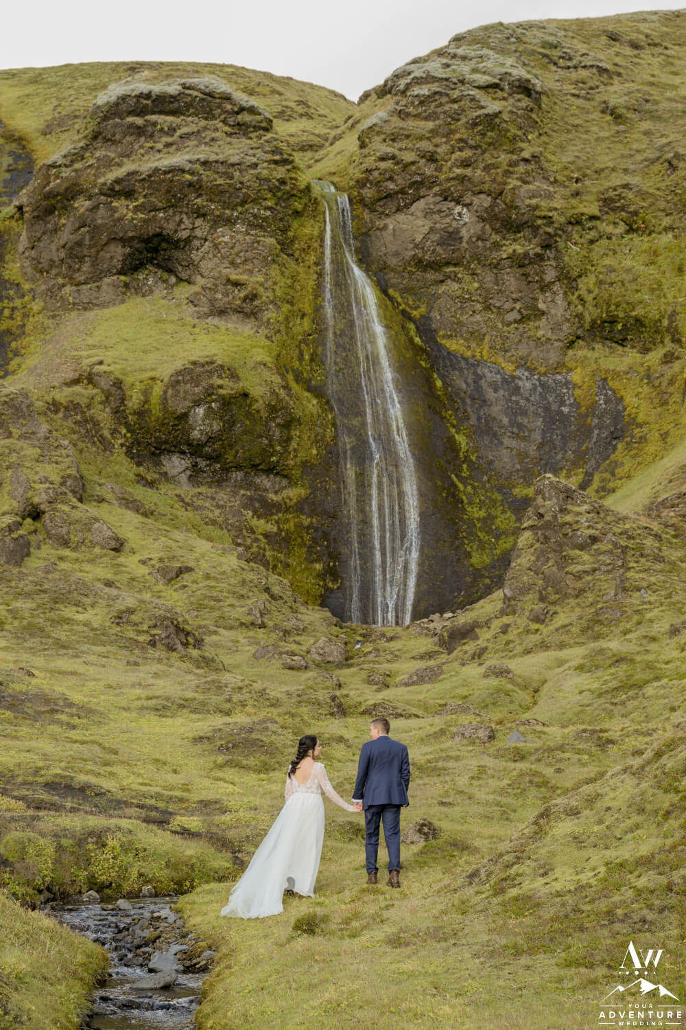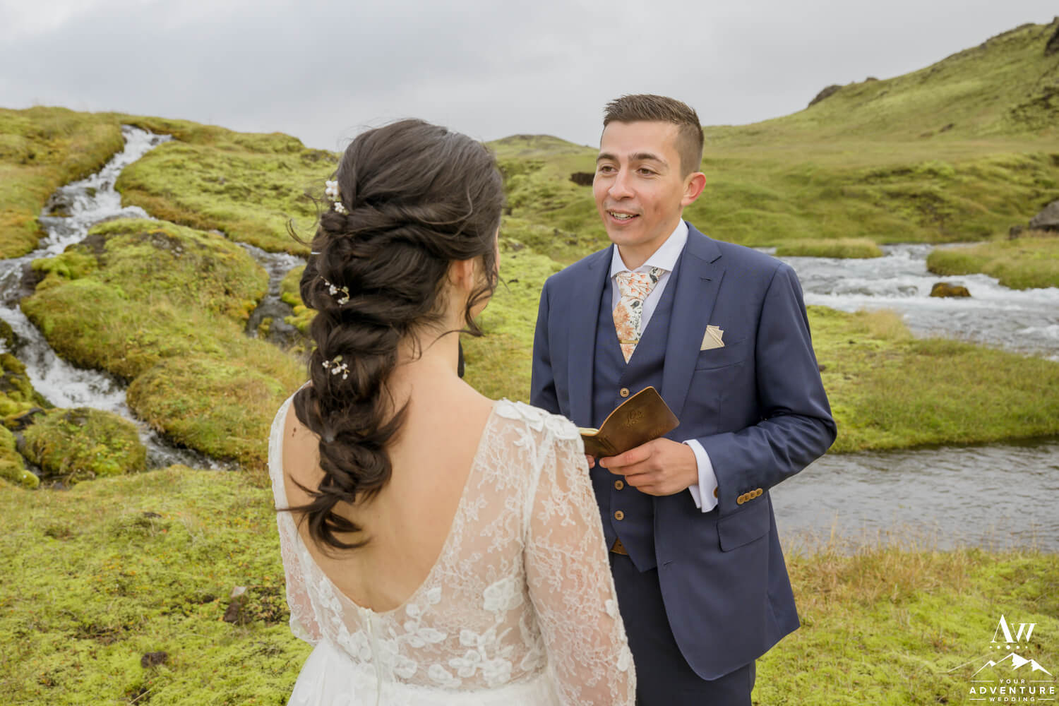 Next, the soon to be newlyweds chose to head into the Icelandic Highlands for a thrilling ride. After, they exchanged vows in a quiet spot in front of a stunning mountain waterfall. For instance, no arch, no chairs, no sound system. Just the presence of our Pastor and words they wrote for each other in personal vows. They laughed, smiled, and embraced. Meanwhile, the moment felt real and unfiltered, which fit their Iceland September Elopement perfectly!