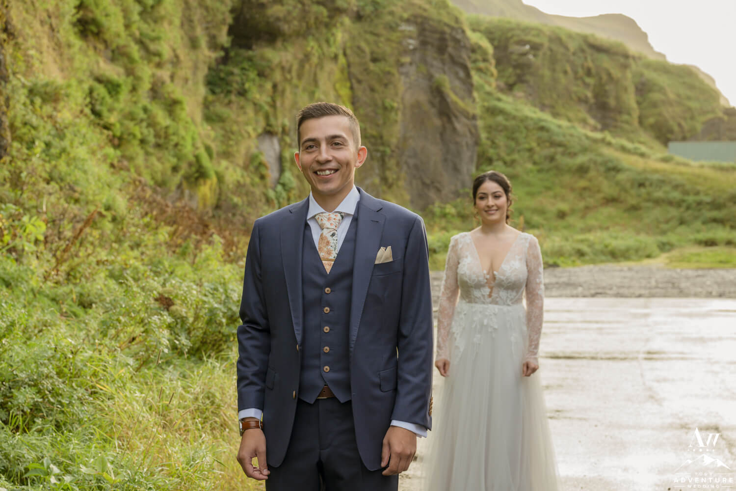 First, September 8th 2024 started out relaxed and rainy. Second, Jazmin and Travis decided to ready together in their fabulous floor to ceiling window hotel room. Third, out local Iceland elopement photographer documented all of their beautiful details. Fourth, the pair met for a first look, which wasn’t in front of crowds, it was intimate. No noise. Just the two of them sharing a moment before heading out for the days adventure!