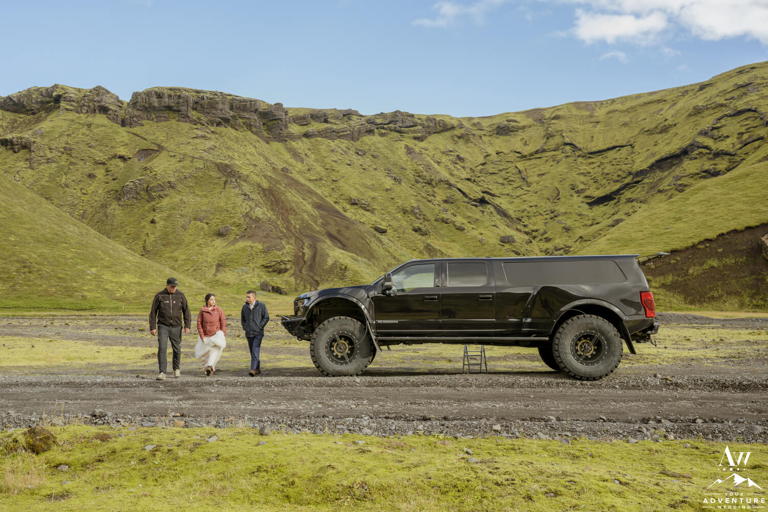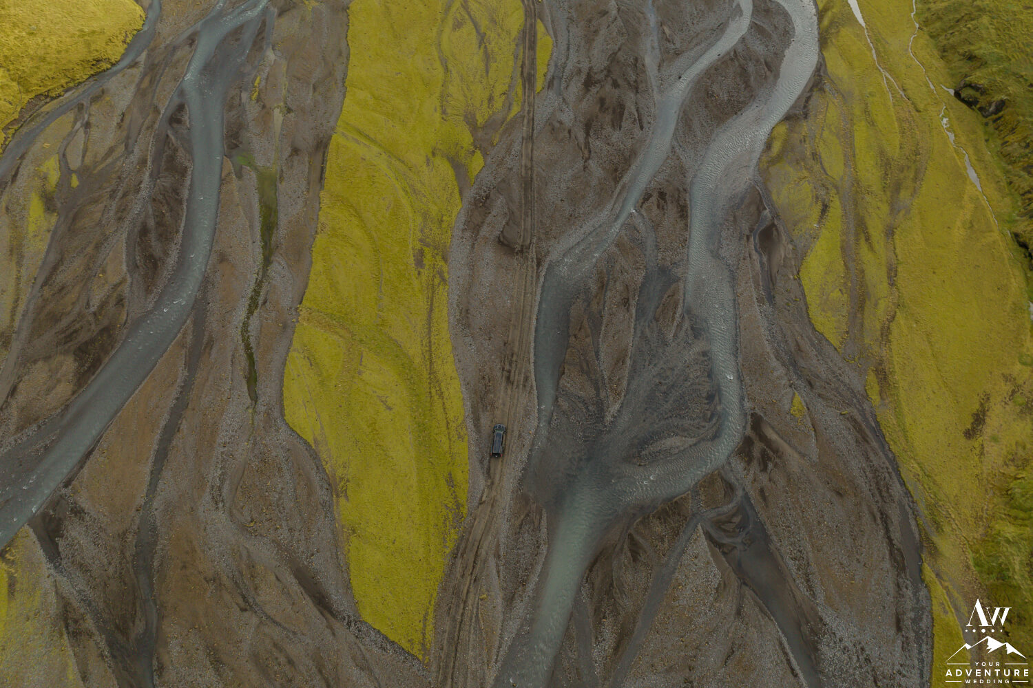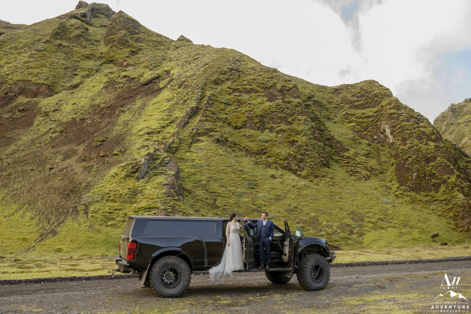 To reach the final locations, we crossed tons of rivers with no bridges. Which is why a super jeep is required to get safely through the highlands. To illustrate, water pushed against the tires adding to the excitement! This part of their Iceland September Elopement was one of the most daring!